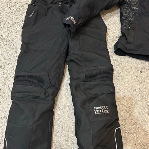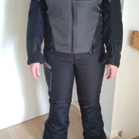 Vähällä käytöllä ollut ajoasu. Takki kokoa 38 ja housut 36S. Takissa ja housuissa irrotettava vuori ja suojat.