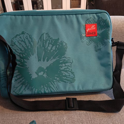 Uudenveroinen läppärilaukku. Irroitettava pitkä hihna ja taskuja sisä- ja ulkopuolella. Kevyt ja näppärä.