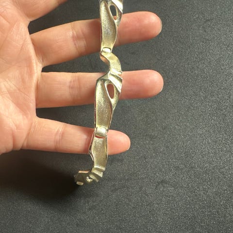 Veistoksellisen kaunis hopeinen nivelletty rannekoru nimeltä Himera, suunnittelija Zoltan Popovits Lapponialle. Valmistusvuosi 1979. Rannekorun pituus n. 18,5 cm. Leimat yhdessä palassa sisäpuolella: Lapponia, sydänkruunu, 925, vuosileima B8. Rannekoru on ehjä ja oikein hyvässä vintagekunnossa, siinä on ajanmukaista patinaa.