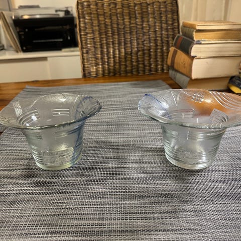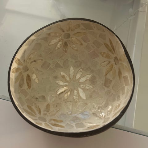 yksi säröillä, kuten kuvassa näkyy. Kulhoja on kaksi, mutta yhdessä on värikäs ja monivärinen kuvio.
