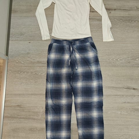 Kaksi kuvien yöpukua joissa pitkähihaiset paidat ja pitkälahkeiset housut.