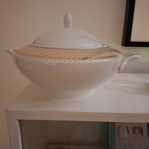 Pasta-aiheinen tarjoiluastia. Läpimitta 30cm, korkeus n. 7cm. Reunassa ja astian pohjassa hyvin pientä kulumaa joka ei kuitenkaan vaikuta astian käyttöön.