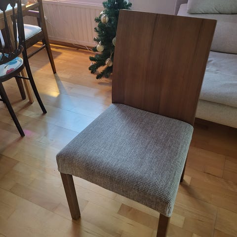 1 kpl täyspuinen ruokapöydän tuoli. Tuolilla on ikää, joten käytön jälkiä jonkin verran. Aiemmin ollut lakkapinta on pääosin hiottu pois, joten tuoli on puuvalmis (vaatii ehkä pientä esityötä ennen uudelleen pinnoittamista). Käytössä toiminut hyvin ja on todella mukava istua. Istumakorkeus 44 cm.