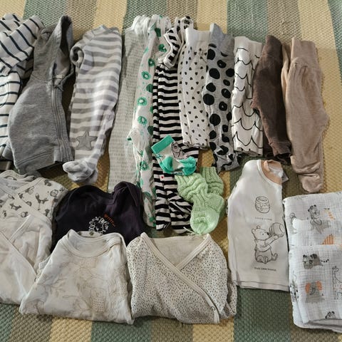 Paljon vaatteita halvalla, eri merkkejä. Enemmän ja vähemmän käytettyjä. Kaikki ehjiä ja tahrattomia. 4 kpl housuja kokoa 62. Parit paksummat housut koko 68. Sukkahousut 62/68. Pehmeä Nalle Puh potkupuku koko 56. Yksi body kokoa 62, kaksi kokoa 62/68 ja yksi kokoa 74. Harmaa mekko koko 68, kukallinen tunika koko 74. Neuletakki koko 68. Lisäksi käyttämättömät villasukat. Pesty hajusteettomalla pesuaineella. Savuton ja eläimetön koti.