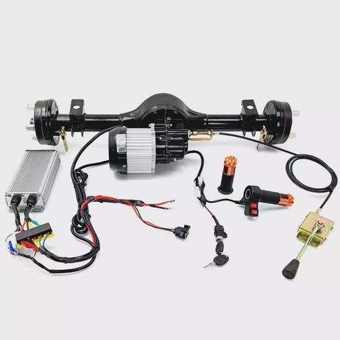 E-Kit 800W 24V sähkötaka-akseli 60cm on valmis akselisto sähköiseen menopeliinE-Kit 800W 24V on sähkötaka-akseli, joka tarjoaa täydellisen perustan sähköajoneuvon rakentamiseen. Laadukas ja pitkäikäinen hiiliharjaton moottori, erittäin vahva akselisto ja kaikki tarvittavat osat tekevät siitä suositun rakennussarjan työ- ja harrastekäyttöön.Tehokas 800W 24V hiiliharjaton moottoriVaihteet: eteen + pakkiNopea ja hidaspuoliPortaaton kaasukahva, 3 nopeusaluettaTehokkaat 120 mm rumpujarrut ja 4x100 pyörännavatRakenna oma sähköajoneuvo helpostiE-Kit sähkötaka-akseli sopii erinomaisesti sähköisiin työkoneisiin, golfautoihin, riksoihin, sähkömönkijöihin, puutarhakärryihin ja muihin tee-se-itse projekteihin. Valmiit kiinnityslaipat akselissa tekevät asennuksesta vaivatonta.Moottoria ohjataan portaattomalla kaasukahvalla, jossa on 3 nopeusaluetta sekä pakki.Tekniset tiedotLeveys: 60 cm (laipasta laippaan)Kantavuus: vahva tasauspyörästö, 56 mm akseliKiinnityslaippojen väli: 35 cmIskarin korvakot: 35 cmRumpujarrut: n. 120 mmMoottorin teho: 800W 24V (hiiliharjaton)Pyörännavat: 4x100 mm (14 mm pinnapultit + mutterit)Vanteen sisäreikä: 62 mmSäädin: 24V 1000WKaasukahva: portaaton säätö, pakkikytkin, 3-asentoinen nopeuskytkinE-Kit sähkötaka-akselin avulla rakennat sähköisen kulkuneuvon tieliikenteeseen tai pihaprojekteihin. Voit toteuttaa sähköisen golfauton, varastokärryn, nokkakärryn, puutarhakärryn tai jopa 4x4 linkkuohjatun sähkömönkijän.Tilaa E-Kit 800W 24V sähkötaka-akseli 60cm ja aloita oman sähköajoneuvosi rakentaminen!Ajoneuvoa voi siirtää käsin lyhyitä matkoja. Pitkäaikainen työntäminen tai vetäminen ilman sähköä voi vaurioittaa säädintä, koska moottori alkaa tuottaa virtaa.Pidemmissä siirroissa irrota moottorin kolmivaihejohdot (sininen, vihreä, keltainen) säätimestä.Videolla oleva akselimalli 48V 2000W. Huom! Videolla akseli on asennettu "väärin" päin! Akseli asennetaan pääasiassa moottori eteenpäin (moottorin pyörimissuunta on käännettävissä sähköisesti). Liitteenä on ohje suunnan kääntämiseen.