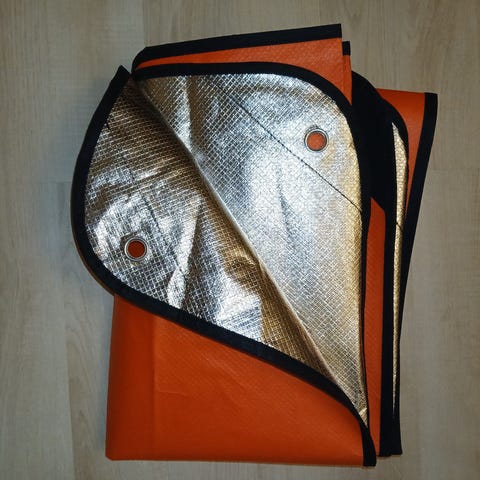 Milopetin 1,5 m x 1,5 m käyttämätön foliopeitto. Heijastaa lämpöä pois. Kevyt ja päästää tuulen läpi.