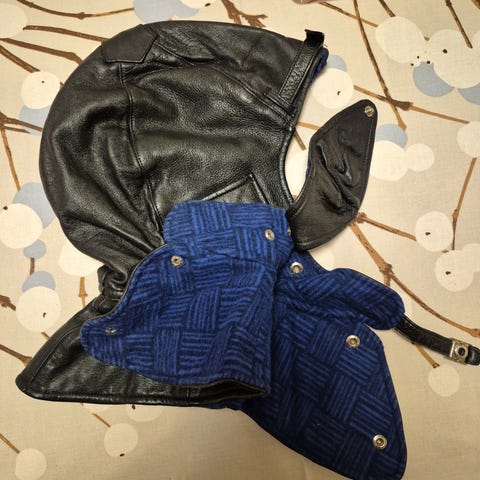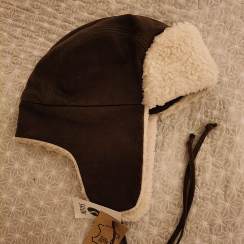 Uusi lentäjänlakki. Ulkopuoli käsittääkseni aitoa nahkaa, vuori lammasta. Koko noin 53. Hatussa ei ole mitään koko, tai valmistajamerkintöjä. Käyttämätön. Eläintalous.
