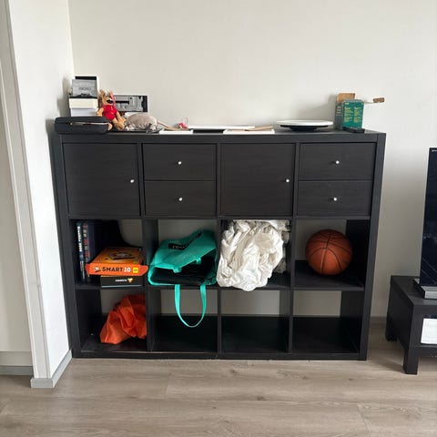 Ikean metallinen hylly / räkki. Itsellä ollut Hi-Fi laite hyllynä.