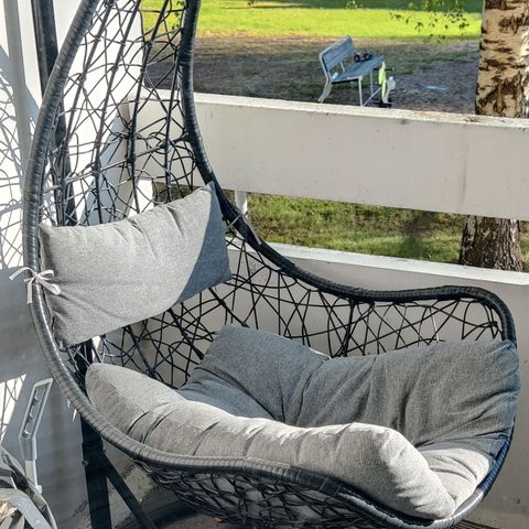 Pari vuotta lasittamattomalla parvekkeella säilytetty polyrottinkinen Pisara-korituoli pehmusteineen. Ulkoilmasäilytyksestä huolimatta hyvässä kunnossa, ollut erittäin vähällä käytöllä.