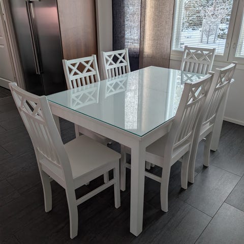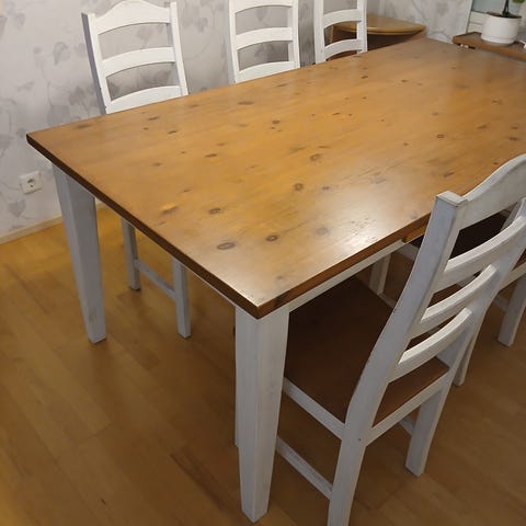 Myydään puinen, valkoinen ruokapöytä ja kolme vankkaa tuolia.