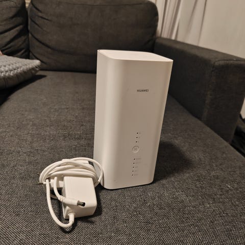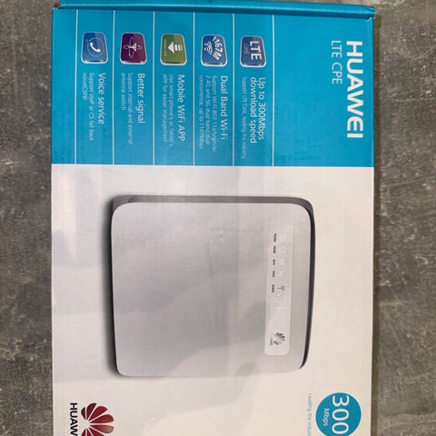 Huawei B715s-23c. Reititin -verkko- ja tietoliikennelaite, joka sisältää useita Ethernet-portteja ja mahdollistaa SIM-kortin käytön mobiiliverkkoon yhdistämiseen. Laite on valkoinen ja suunniteltu kiinteään verkonhallintaan.