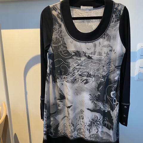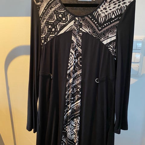 Naisten uudenveroinen A-linjainen tunika. Koko S, kaikai 46cm venyttämättä. Kangas hyvin venyvää. Pituus takaa 74cm. Helmassa kivat halkiot ja leikkaus. Mukaan kuuluu musta huivi, jota voi pitää kaulalle asteltuna.