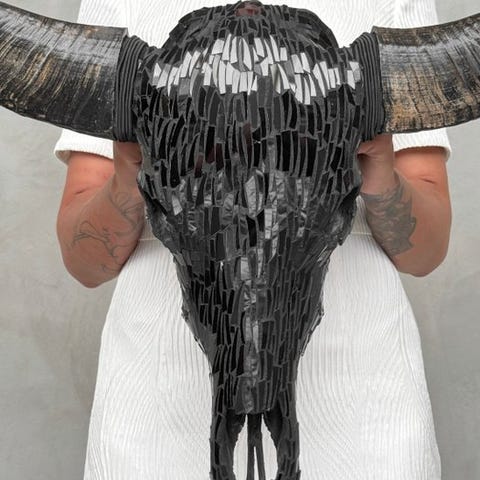 Suuri buffalokallo, joka on käsin kaiverrettu lahjakkaiden balilaisten käsityöläisten toimesta. Heidän isänsä ovat siirtäneet ikivanhan kaiverrustaidon pojilleen. Tämä kallo on täysin avokaiverrettu. Kaiverrus on poikkeuksellisen korkealaatuista. Kalloon on kaiverrettu kaunis perinteinen balilainen kuvio.