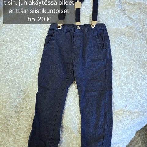 Newbie ihanat ruskeat henkselihousut kokoa 104. Materiaali puuvilla. Muutamat juhlat juhlittu, kunto oikein siisti. Irrotettavat henkselit, avattavat napit edessä, oikeast taskut. Vyötäröllä säätökuminauha.