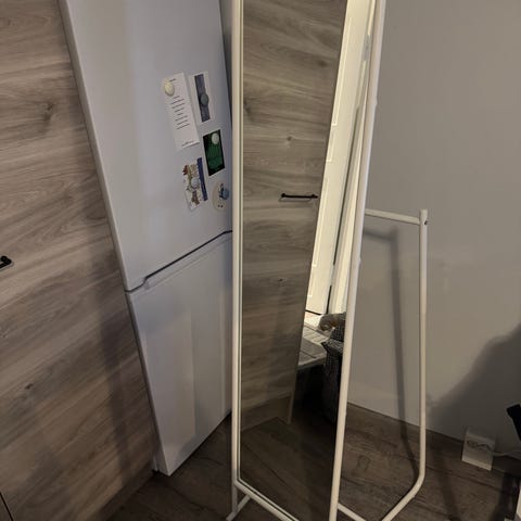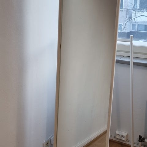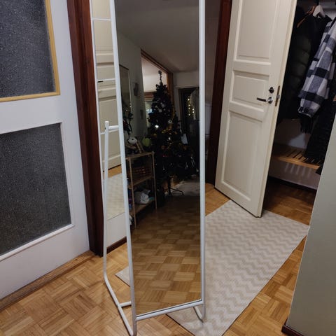 IKEA KNAPPER Lattiapeili, valkoinen, 48x160 cm, jossa on valkoinen runko ja useita vaatekoukkuja takana. Peili on seisova ja soveltuu esimerkiksi makuuhuoneeseen tai eteiseen vaatteiden ja asusteiden ripustamiseen. Erittäin hyvässä kunnossa , ei naarmua tai muuta vastaava , uutena 80e. Nouto Vuosaaresta tai kuljetus pientä korvausta vastaan.