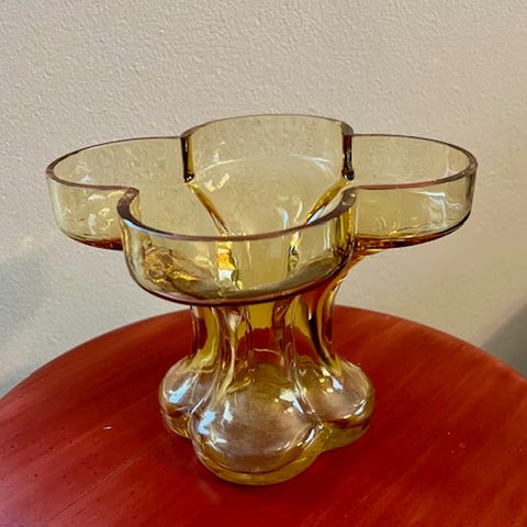 Tynellin Onnenlehti vaasi, korkeus 14,5 cm, halkaisija 19 cm. Malli 1218. Värinä amber eli meripihka, joku puhunut hunajan väristä. Ollut käytössä, risku suuaukon sisäpuolella, näkyy kuvissa, ei haitannut. Pohjassa ei jälkiä. Tuotannossa 1971-76. Nouto Helsinki, miel. Vuosaari.