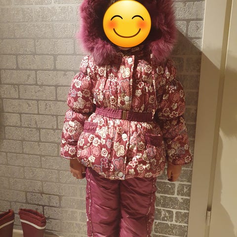 Takki karvahupulla, housut henkseleillä. Muutamia kertoja ollut käytössä. Mentiin viime talven ulkoilut haalarilla ja tämä oli kaapissa. Tosi vähän käytetty siis tämä puku.