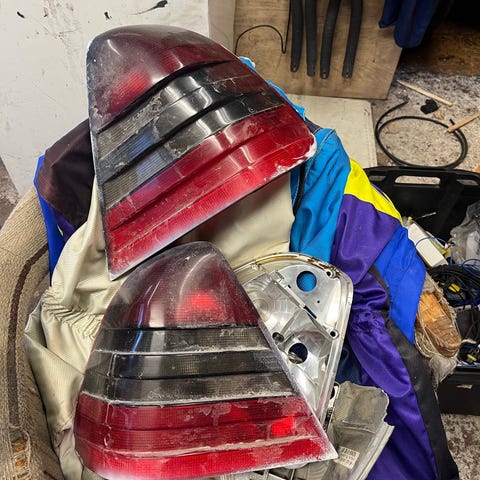 Siitä seuraavalle itselle turhiksi jääneet takavalot. Umpiot on lailliset. Muuten hyvässä ja siistissä kunnossa mutta vasemman umpion muovi kupu halki niinkuin kuvassa näkyy ja sen johdosta vasemman puolen ledeistä palaa osa himmeemmin.
