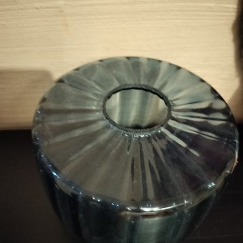Vanha lasinen valaisinkupu. Korkeus 19 cm. Halkaisija n.21 cm. Ylhäällä oleva aukko n. 3.5 cm. Väri savun sininen. Tekijästä ei tietoa. Pieni kolhu kuvun alaosassa reunassa.