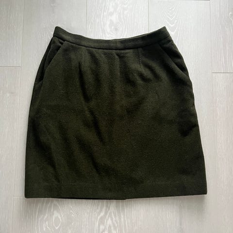 Musta, tyylikäs villakangashame kotimaista vintagea. Yksinkertaista hametta koristavat kauniit laskosmaiset yksityiskohdat helmassa. Hame on villaa ja siinä on vuori. Hameessa on muotolaskokset, vetoketju ja nappi.