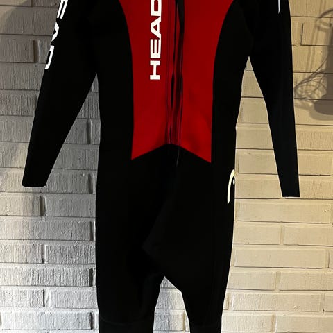 Hyvässä kunnossa, ei reikiä. Oikeassa olkapäässä pientä nukkaa tarrakiinnityksen vuoksi (kts. kuva). Ei reikiä, vetoketju toimii hyvin. Olen itse 168cm pitkä ja noin 73kg, mulle ollut sopiva. Kaupanpäälle turvapoiju. Tästä hyvä märkäpuku vaikka ensimmäiseen triathloniin!