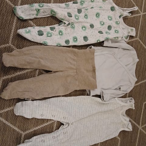 Setti sisältää 1kpl yökkärin, 2kpl bodya, 2kpl housut ja 1kpl puolipotkuhousut. Siistejä, käytettyjä. Puolipotkuhousuissa enemmän nukkaa, lisäksi näiden koko merkattu olevan 50, mutta on käytetty kaikkia samaan aikaan.