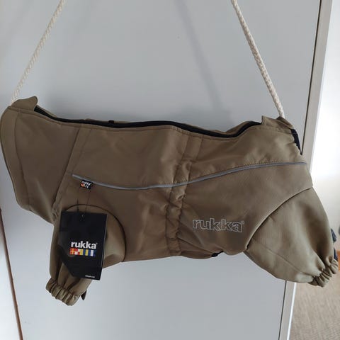 Rukka musta koiran takki, koko 35. Valmistettu polyesteristä ja elastaanista, karvavuori sisäpuoli. Takissa on vetoketjullinen aukko ja heijastavia yksityiskohtia. Ollut Parson russel terrierillä.