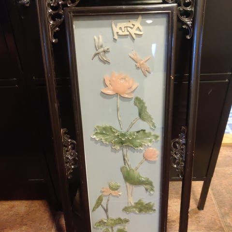 Aasialainen kukka aiheinen taulu koristeellisilla kehyksillä. Kunto kuin uusi. Kehykset mustat. Ehjä siisti kaikin puolin. Pituus 89 cm ja leveys 39 cm.