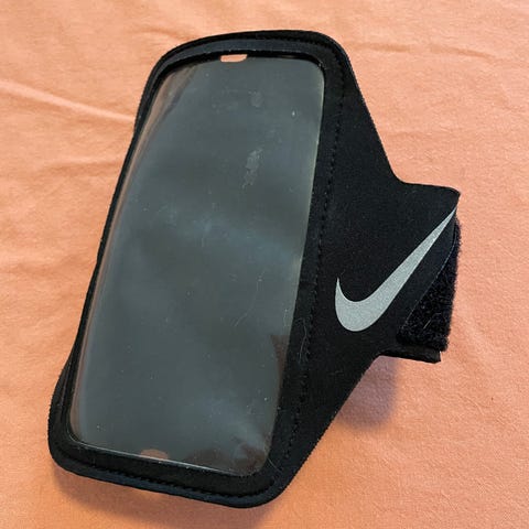 Käyttämätön käsivarteen tarrakiinnitykselöä laitettava säilytystasku puhelimelle sekä avaimille.