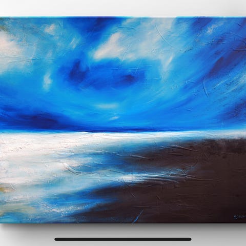 Maalaus kankaalle, koko 80x80 cm. Kuvassa valkoisia ilmeisesti tupasvilla kukkia oranssin ja vaalean sävyisellä taustalla. Kangas on pingotettu puukehykselle.