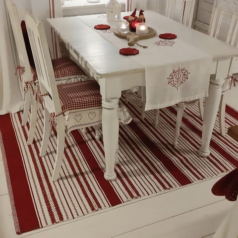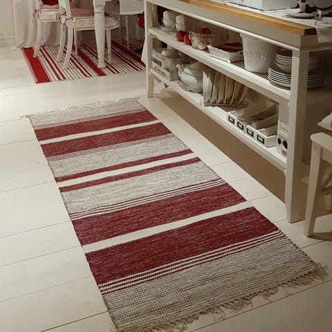 Beige-punaraidallinen puuvillamatto.
