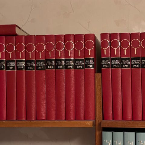 Poliisi kertoo kirjoja vuosilta 1981-1983, 1985-1999 ja 2001-2003. Hyvässä kunnossa (1994 pientä kulumaa). Mielellään koko pino kerralla 60€. Yksitäin 4e kappale tai tee tarjous haluamistasi kirjoista.