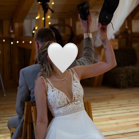 Ostin itselleni vähän turhan ajoissa kerran käytetyn sifonkisen hääpuvun, mutta päädyinkin toiseen mekkoon. Mekko on pesetetty, eikä siinä ole mielestäni käytön jälkiä. Oikein kevyt päällä.