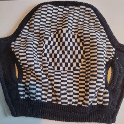 Kuvan mukainen pienen koiran puku. Sopii esim kääpiömäyräkoiralle. Pituus kaulusresorin tyvestä 40 cm.