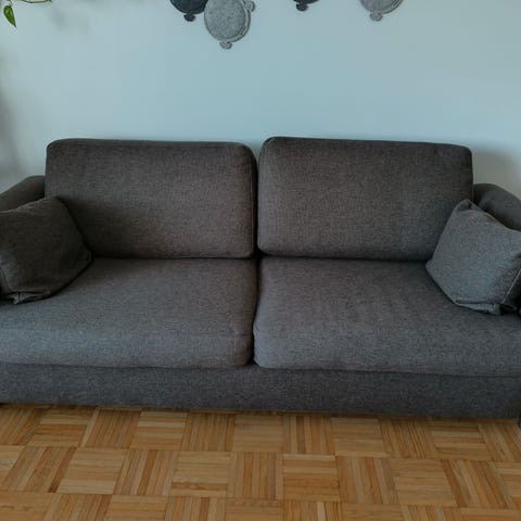 Harmaa kangasverhoiltu 3-istuttava sohva, jossa puurunko ja mustat jalat. Sopii olohuoneeseen tai muuhun oleskelutilaan.