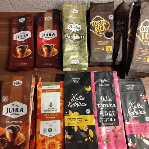 Juhlamokka vaalea ja tumma yht 440 kpl + 9 presidenttiä ja muita 30. Yhdessä kahvipussissa 19 pussia sisällä.