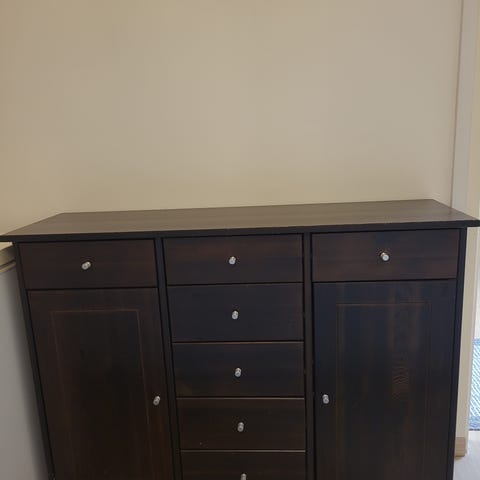 Itse mustaksi maalattu lipasto, sisältä alkuperäisen värinen. Lipastossa päällä joitain naarmuja, muuten ehjä. Vain nouto.