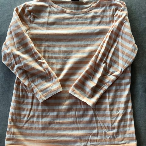 Erittäin hyväkuntoinen Marimekon tasaraitapaita oranssi-valkoisena, kokoa S. 2010-luvun alun mallia. Kotimaassa valmistettu. Resori pääntiessä ja hihansuissa.