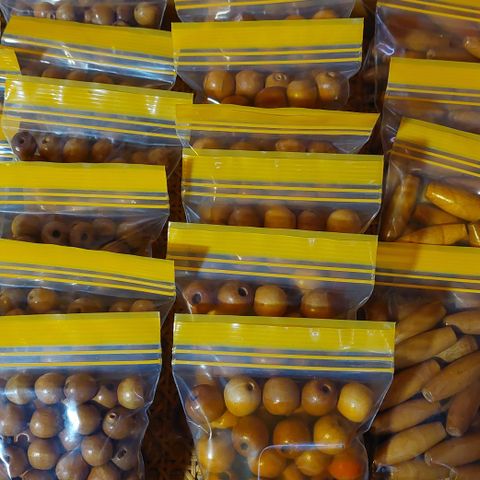 Erilaisia puuhelmiä monissa väreissä ja eri kokoisina. Helmiä on sekä värikkäitä että luonnollisen ruskeita ja valkoisia sävyjä. Sopii erilaisiin askartelu- ja koruprojekteihin.