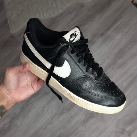 Nike Tennarit koko 38. Tennarit ovat valkoiset ja vaaleansiniset, valmistettu nahkamateriaalista. Kengät ovat korkeavartiset ja sopivat arkipukeutumiseen.