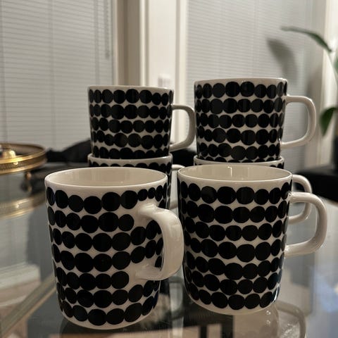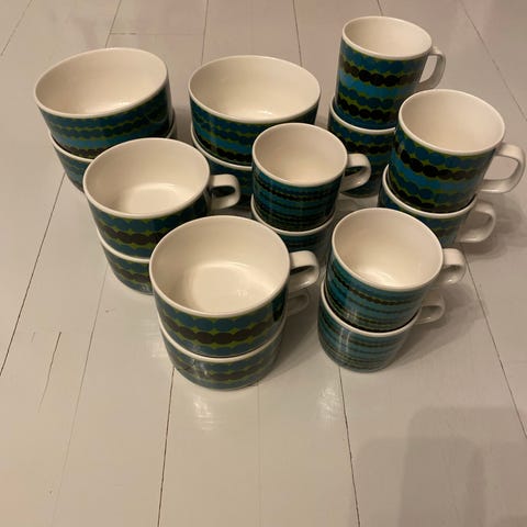 Myydään uudenveroiset Räsymatto astiat ruskealla palloraidalla.