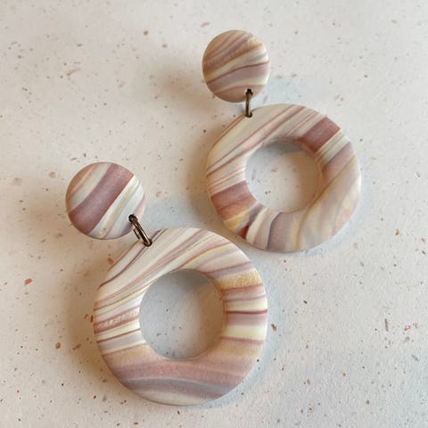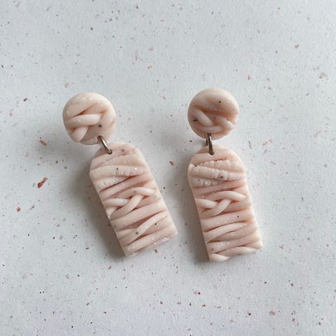 Tyylikkäät, valkoiset korvakorut kohokuvioilla. Valmistettu polymeerimassasta. Pituus noin 5,9cm.