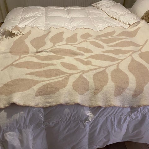 Hyväkuntoinen vanha kukkakuvionen villainen peitto/huopa, toinen puoli vaalea toinen tummempi. Päädyt kantattu kullankeltaisella kankaalla (ehkä satiinia) noin 2,5cm leveys.