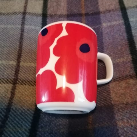 Myydään uudenveroinen 2,5dl vihreäsävyinen Ruutu-Unikko muki.