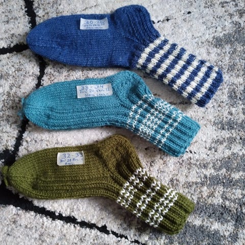 Käsinneulotut lasten moniväriset villasukat 7 veljeslanka langasta 75% villaa ja 25% polyamidia.