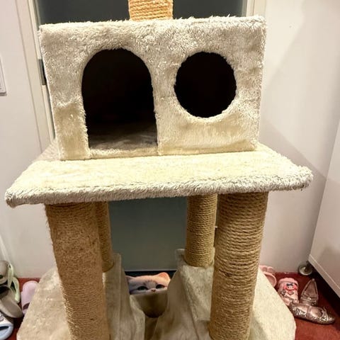 Kissojen kiipeilypuu, lähes käyttämätön, kattoon menevä mutteri hieman vinossa, helppo vaihtaa kokonaan uuteen, osat kaikki tallessa, mukana tulee myös seinään kiinnitettävä tuki joka pitää puun paikallaan.