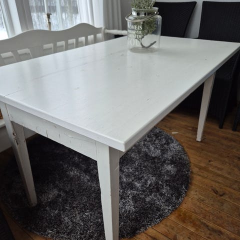 Pöydän pinnassa muutamia haaleita naarmuja, yleisilme erittäin siisti. Tuolit (6kpl) tukevia, kaipaavat uudelleen verhoilua.
