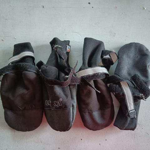 Rukka koirien tossut musta väri, koko 7. Tossut on valmistettu kestävistä materiaaleista ja niissä on tarrakiinnitys sekä vetoketju helpottamaan pukemista. Tossujen pohjassa on liukuestepinta koiran turvallisuutta varten. Yhdestä tossusta puuttuu sisältä pohjasta kangas. Ollut käytössä keskikokoisella koiralla. Ovh 31.99€ Mustissa ja Mirrissä. Varustettu heijastimilla. Pari kertaa käytetyt.
