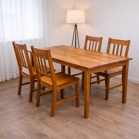 Musta ruokapöytä ja neljä tuolia erittäin hyvässä kunnossa. Pöydän pinta on erittäin puhdas ja sileä. Käytön jälkiä on jonkin verran. Ei halkeamia eikä irtokappaleita. Kestävä ja hyvässä kunnossa. Ei mitään ongelmia.