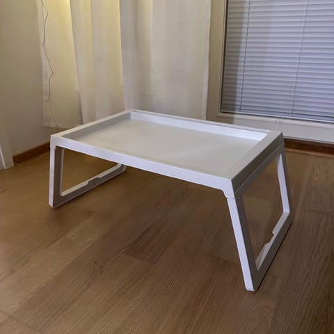Myydään uutena ostettu ja vähän käytetty Ikea Klipsk vuodetarjotin. Kuvassa tarjotin seisovana ja koottuna kasaan.